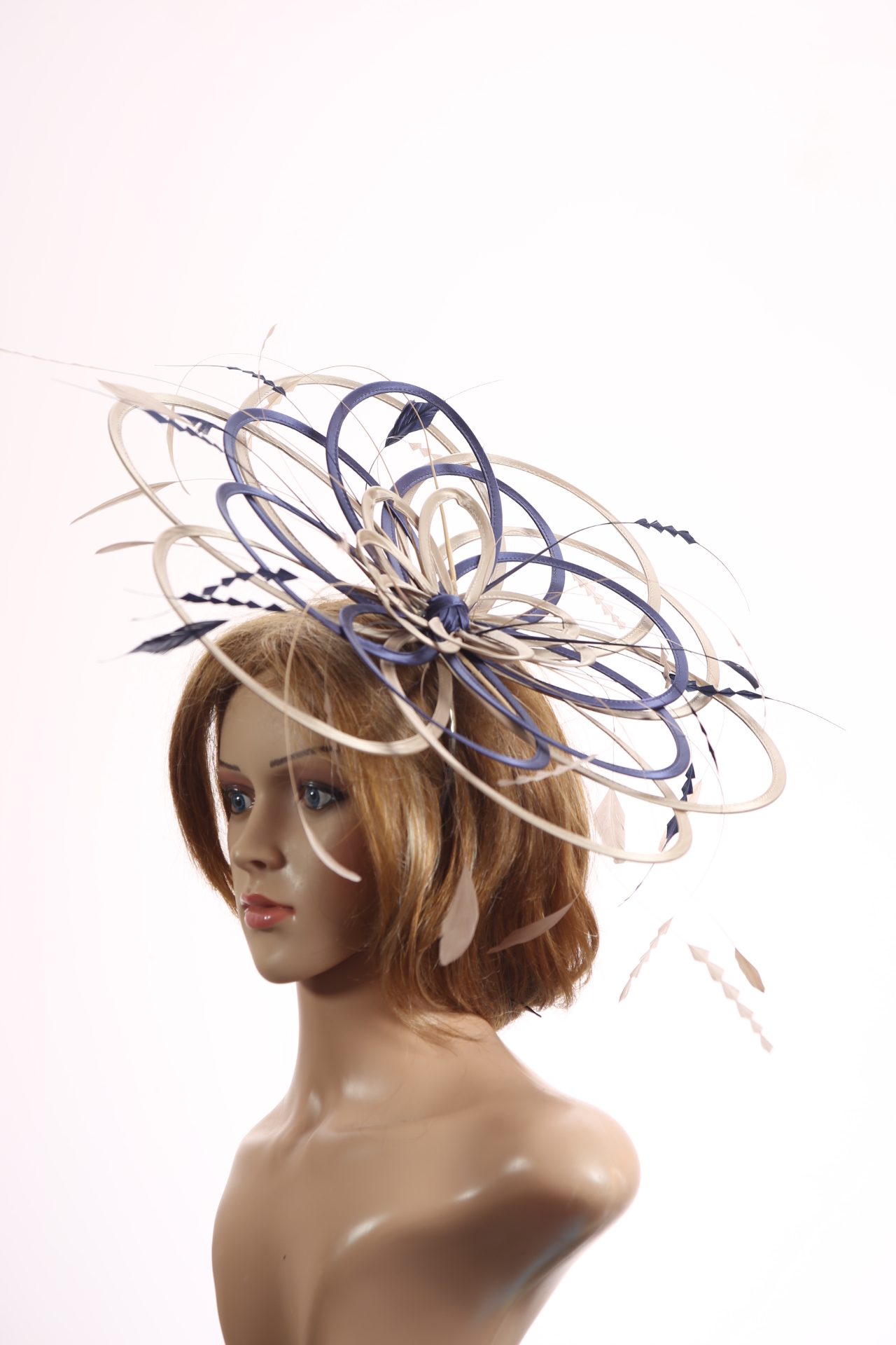 Large sized fascinator hat made up of three tiers of satin loops and adorned with coque feathers.