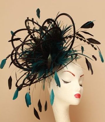 Black and Teal Green Large Satin Feather Fascinator hat with Chevron Cut Coque Tails – Elise