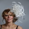 A medium fascinator hat made with satin loops and adorned with coque and hackle feathers. Rhinestones on wired stems which match the metal on your headband.