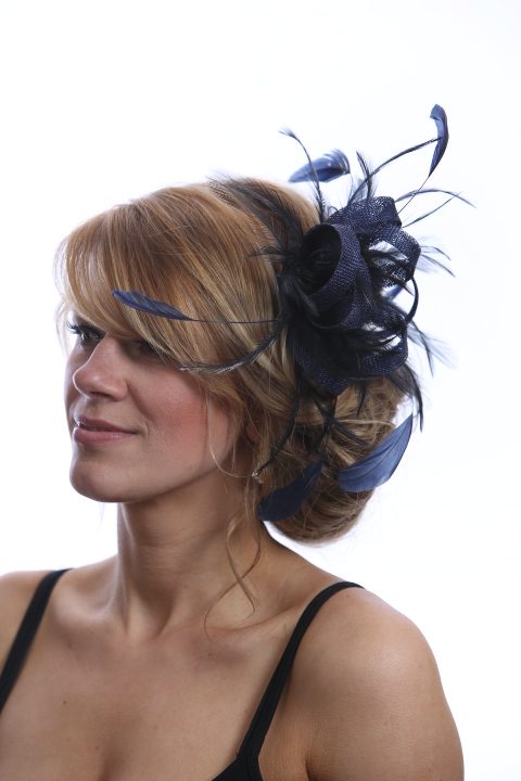 Small fascinator hat made with sinamay loops and adorned with coque and hackle feathers also in navy.