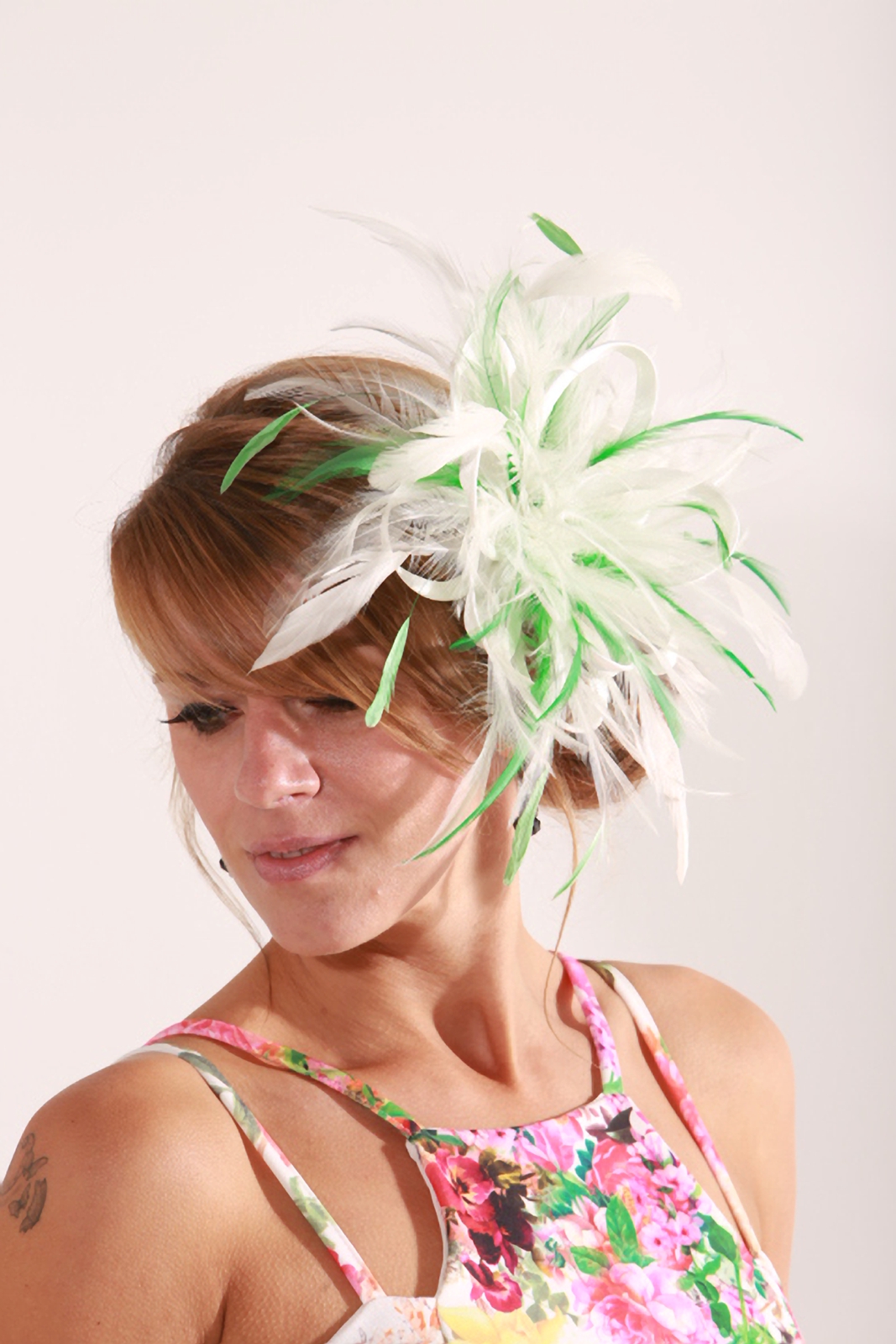 Small Ivory Satin Fascinator hat with Emerald Green feathers – Abbie