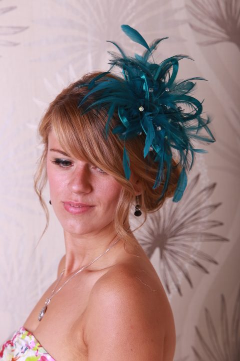Rhinestone Satin Fascinator hat with feathers – Jade/Teal Green – Julie