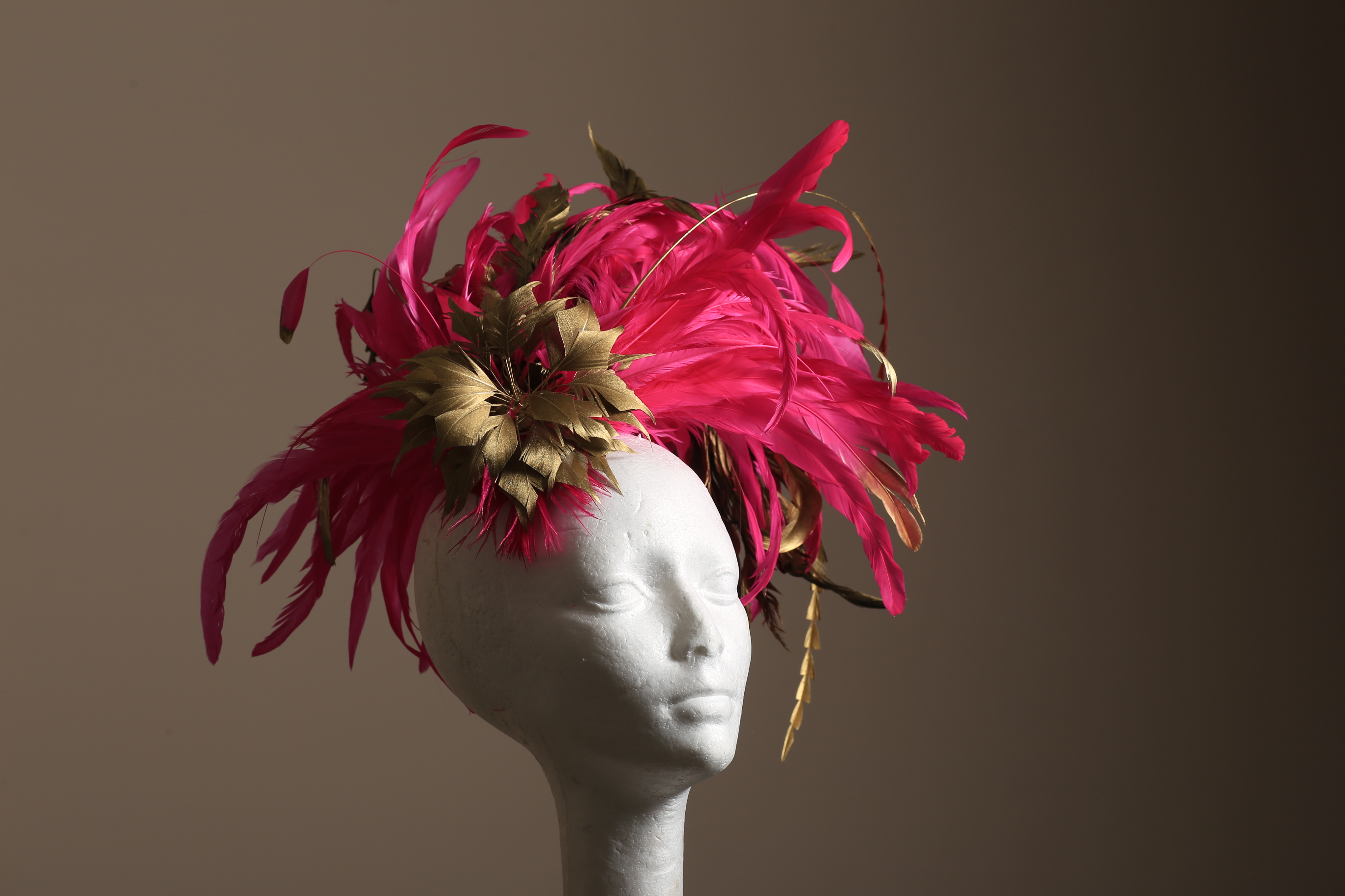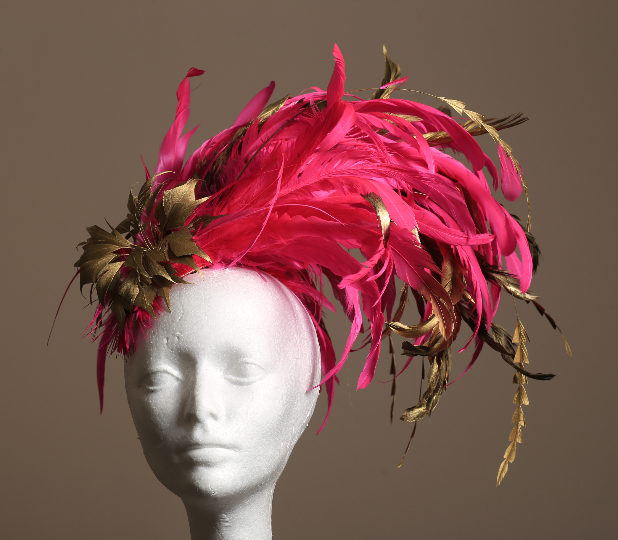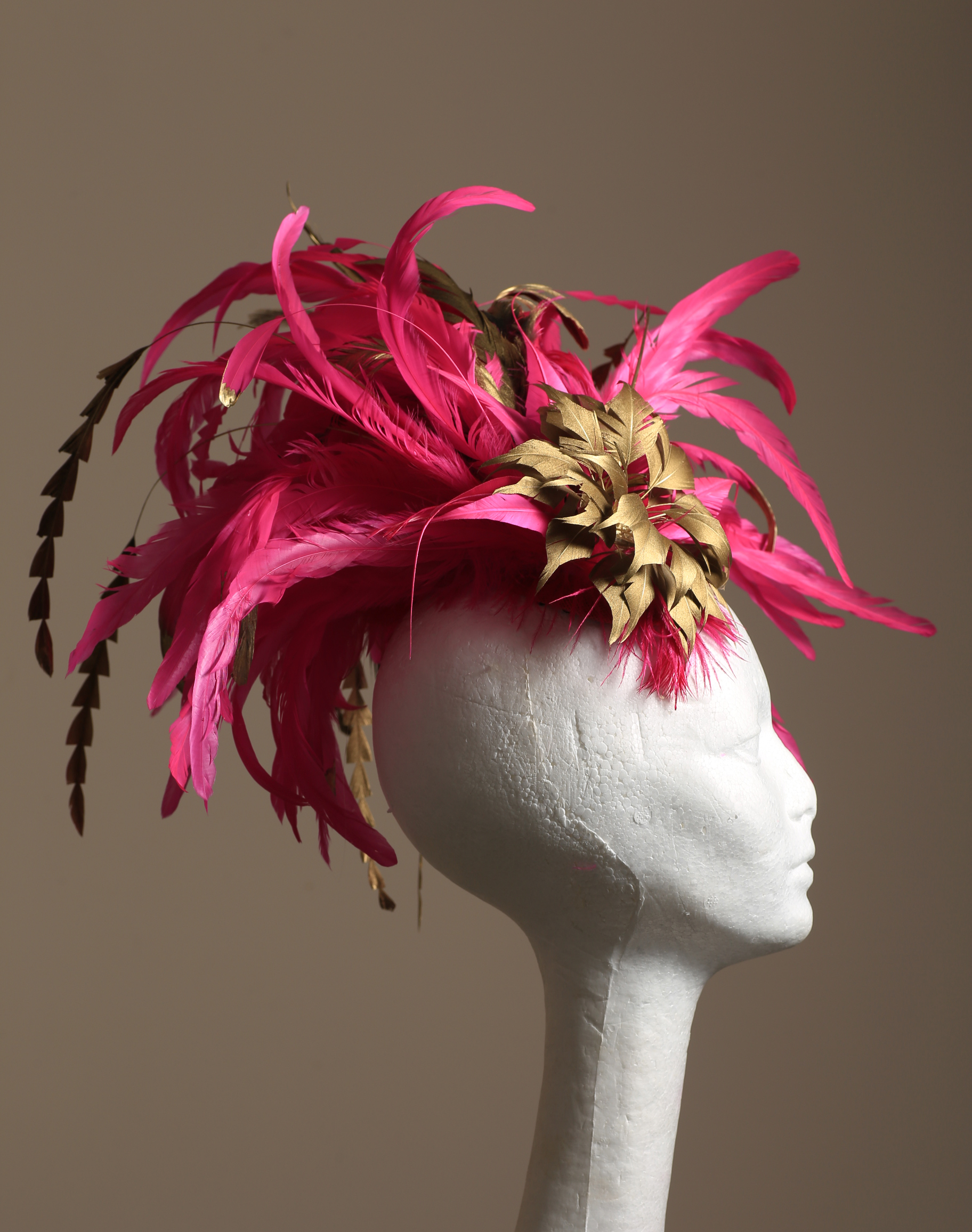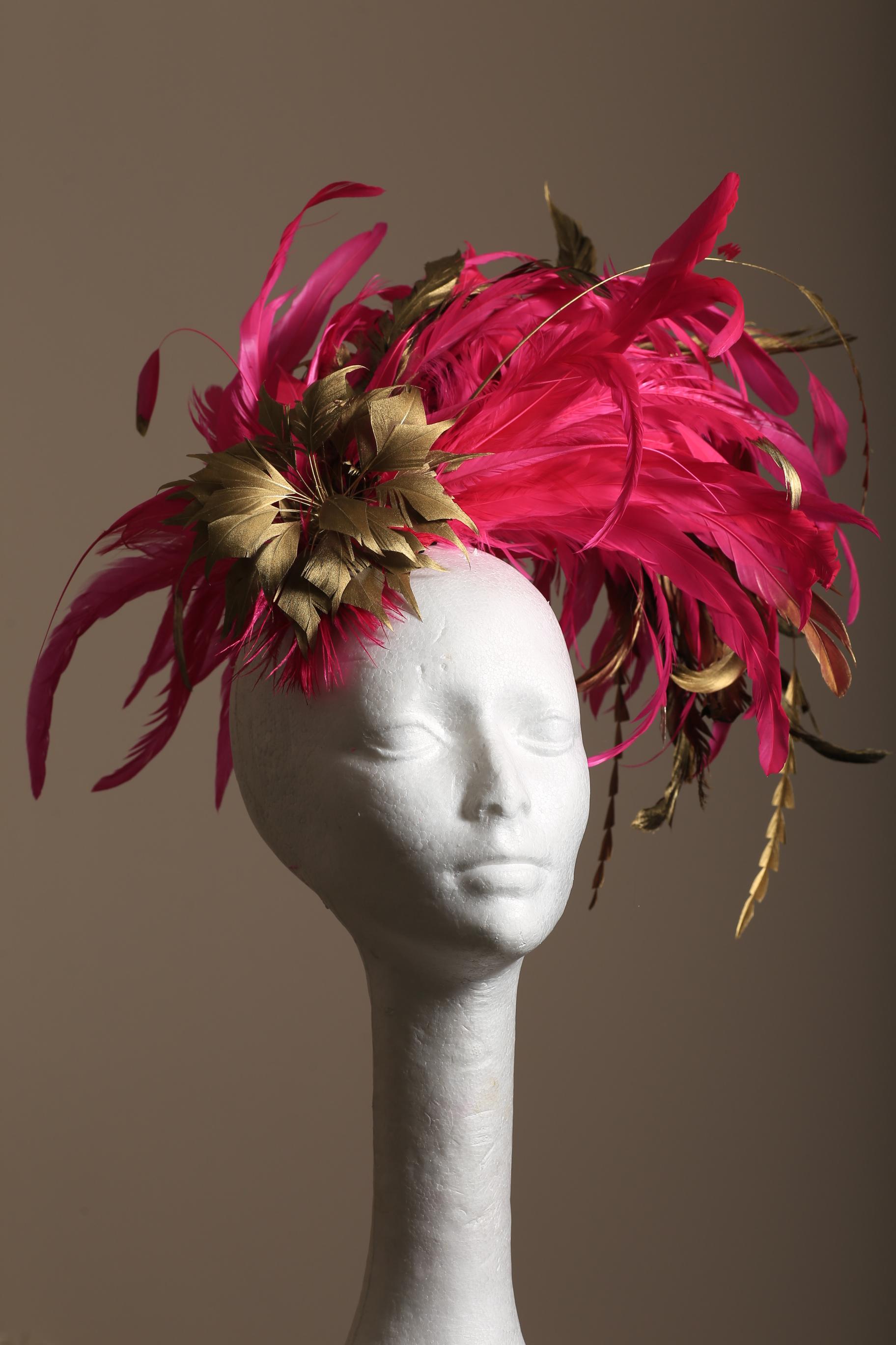 This is a very large Mohawk style pillbox fascinator made using lots of curled coque tail feathers, biots, hackle.