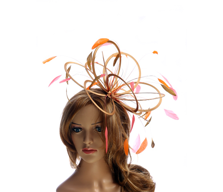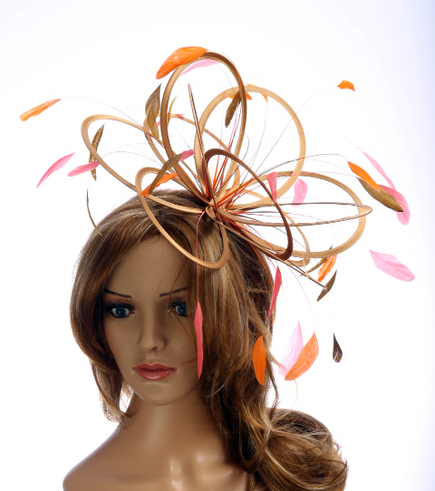 A satin loop style, medium size fascinator hat adorned with three different colours of coque feathers.