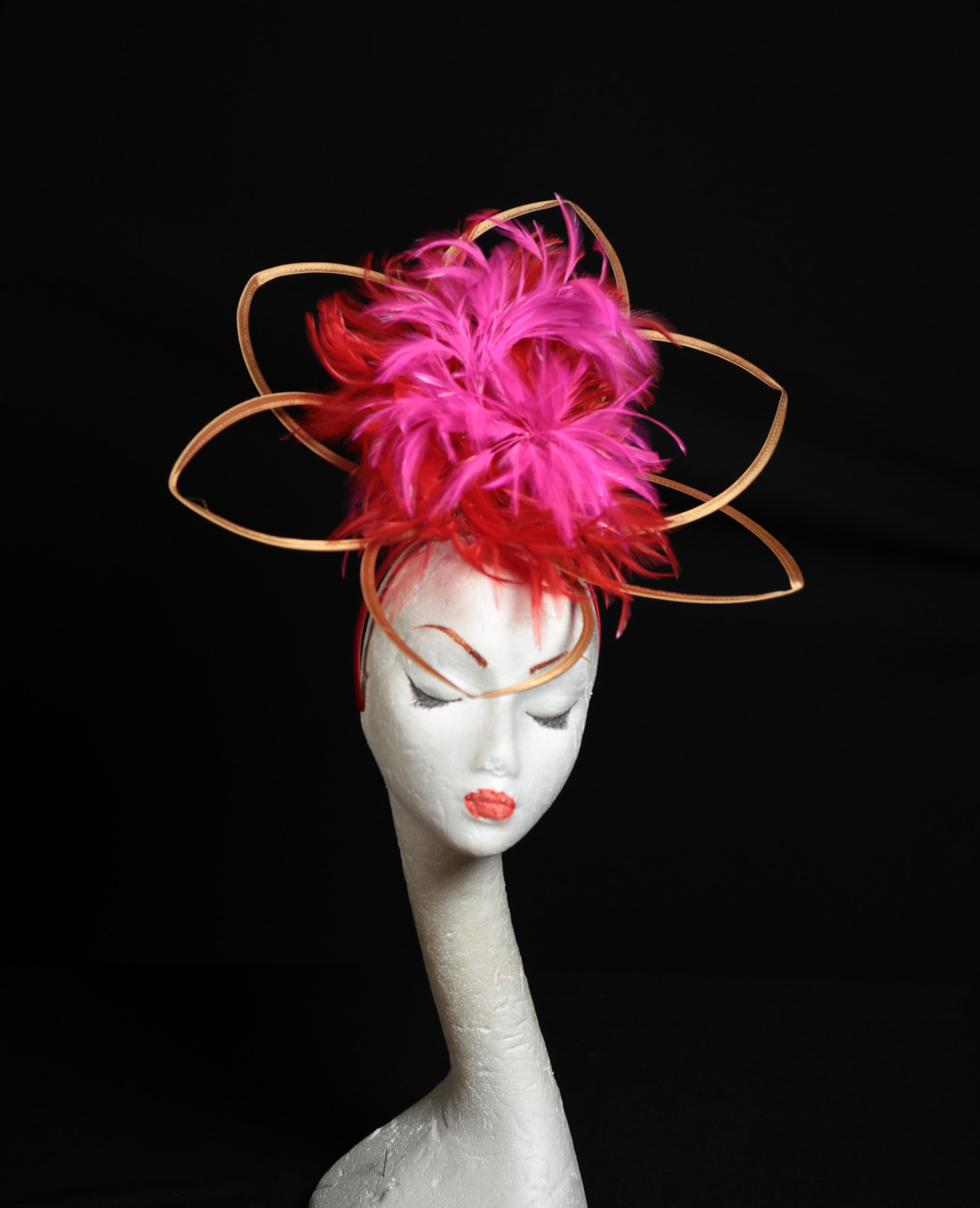 This is a firm satin petal shaped feather fascinator adorned in the centre with wired red and flo fuschia pink hackle feathers. Ive wired the feather mounts so that they can be adjusted for height. Ie in the photos you will see i have wound them into a tall circle shape. They can go higher or flatten down very easily.