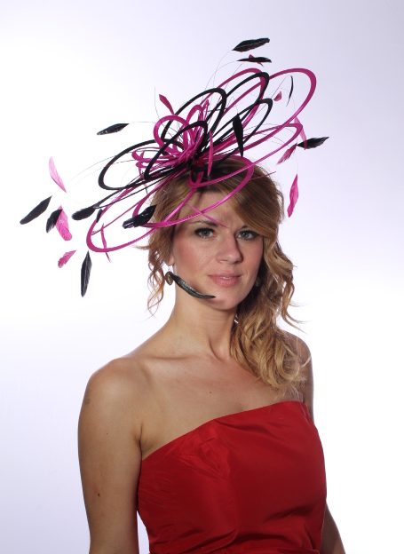 Large sized fascinator hat made up of three tiers of satin loops and adorned with coque feathers.