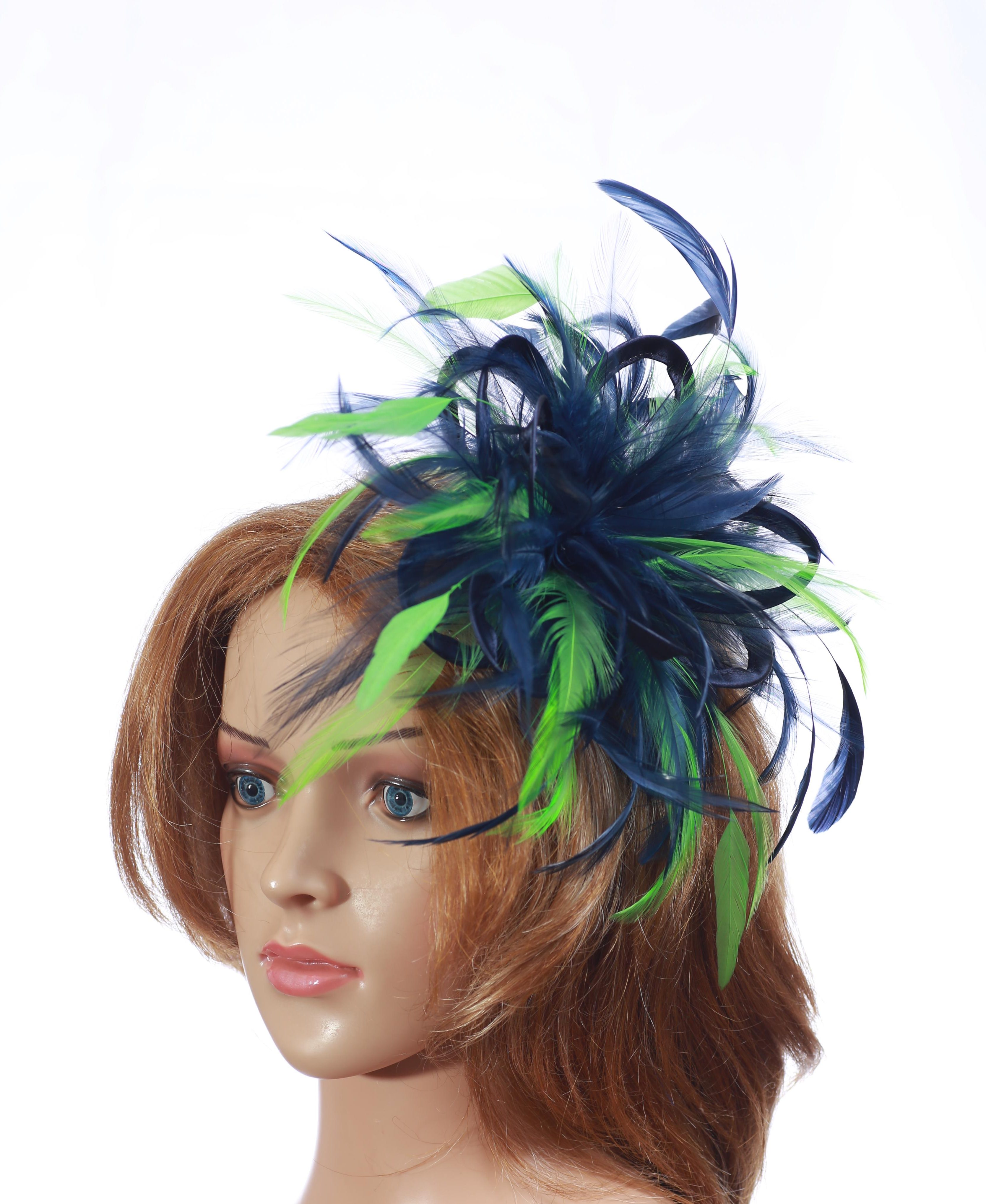 Small fascinator hat made with satin loops and adorned with coque and hackle feathers.