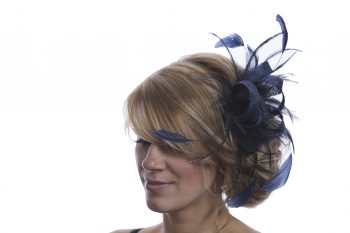 Small fascinator hat made with sinamay loops and adorned with coque and hackle feathers