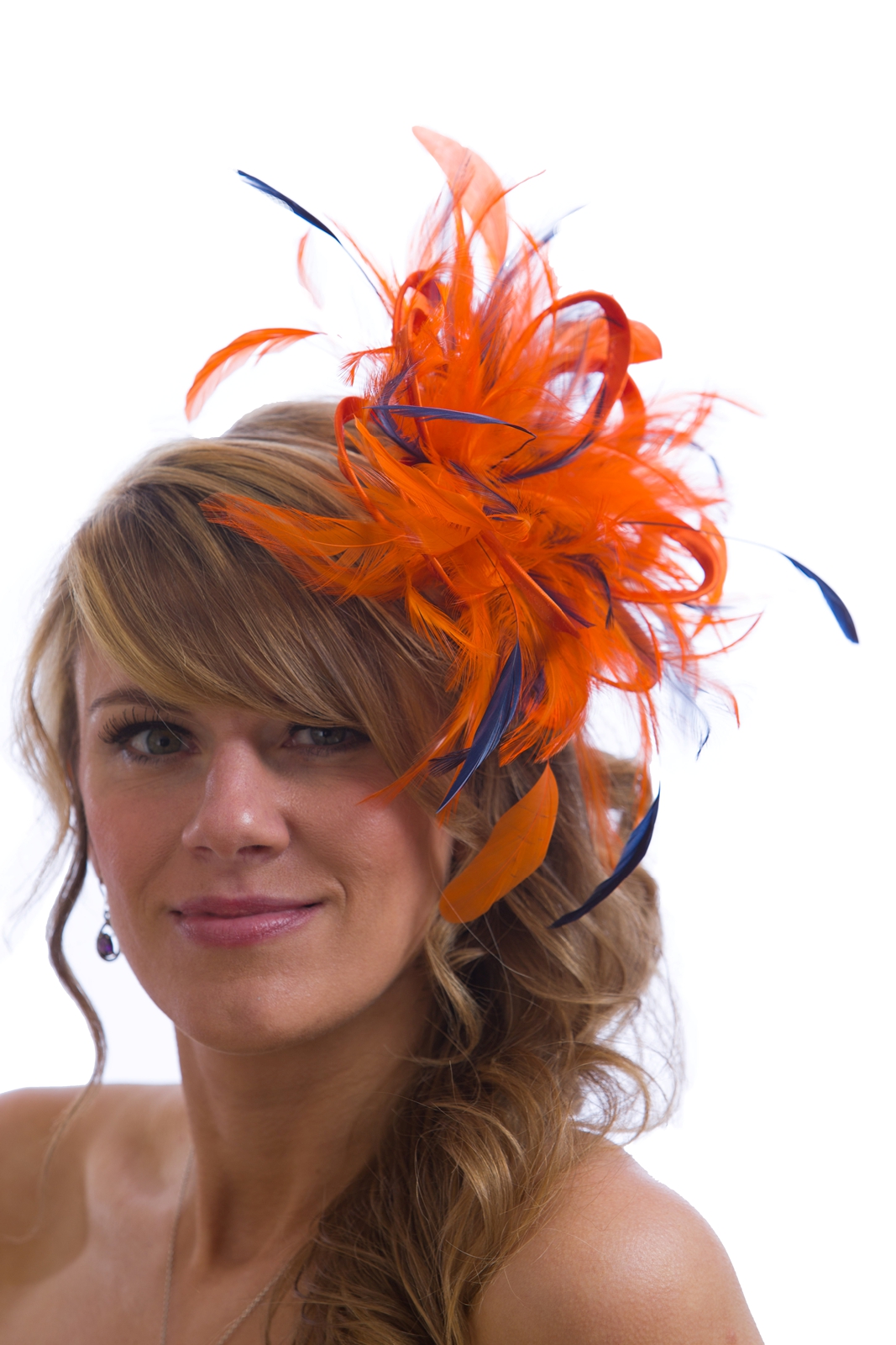 Orange and Navy Blue Satin Feather Small Fascinator hat – Abbie