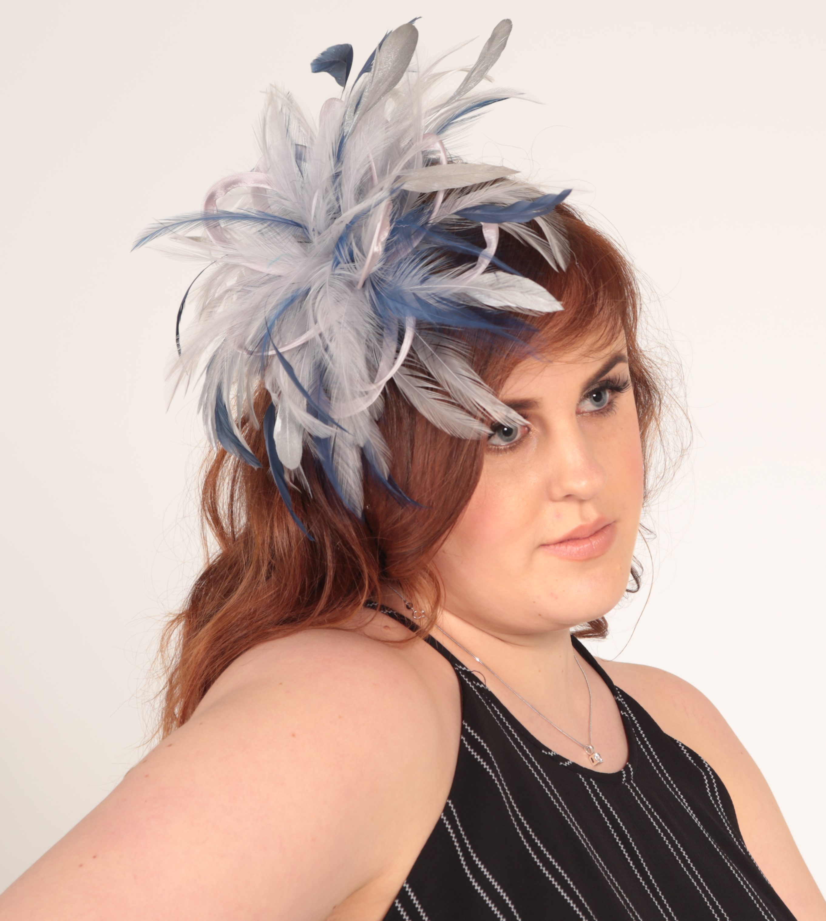Silver and Navy Blue Satin Feather Small Fascinator hat – Abbie