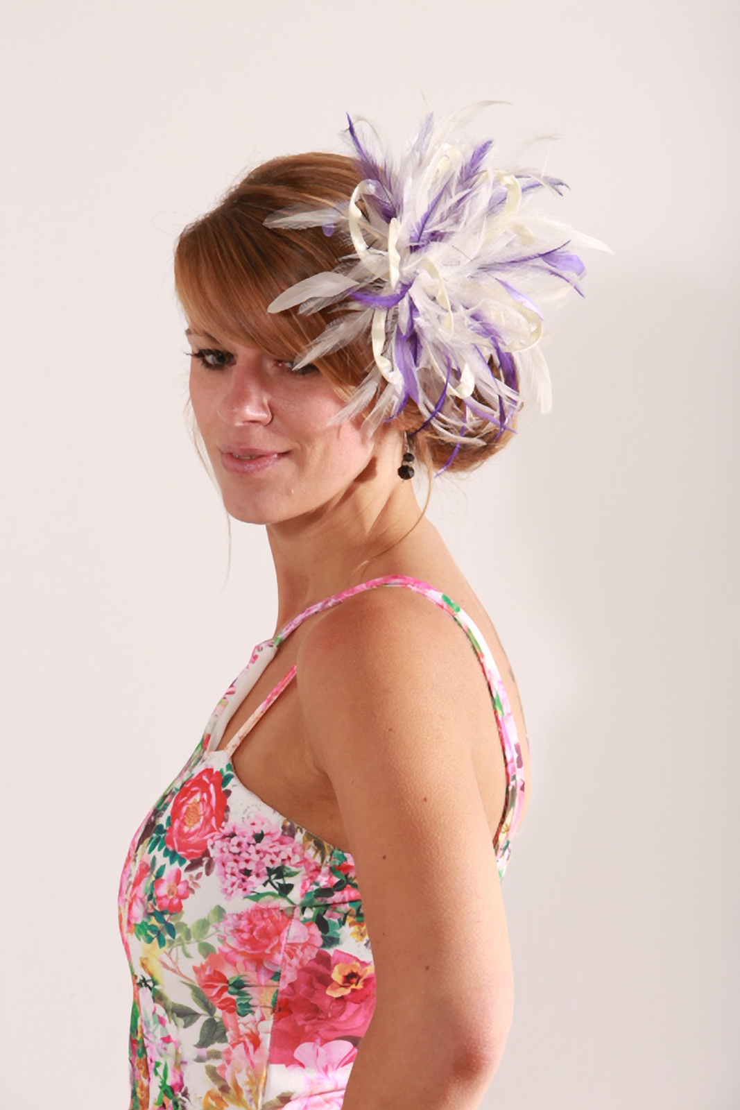 Small Cream Satin Fascinator hat with Purple feathers – Abbie