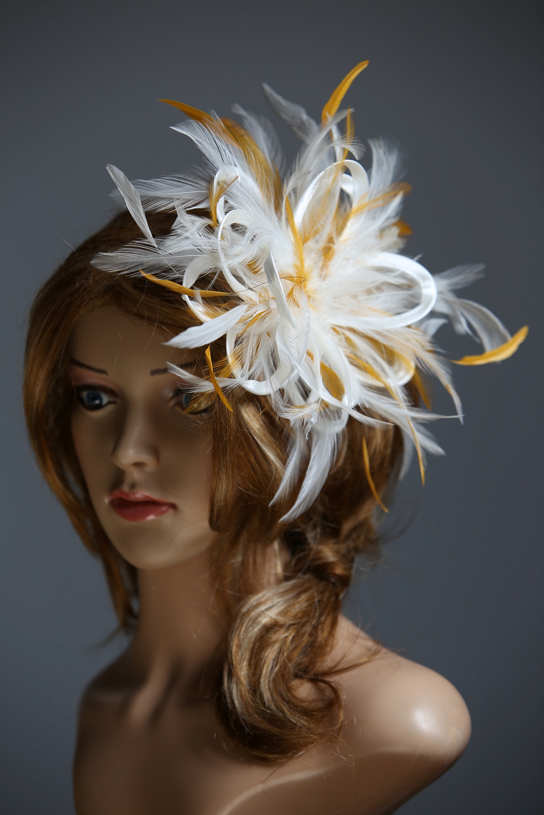 Small Ivory Satin Fascinator hat with Mustard Yellow feathers – Abbie