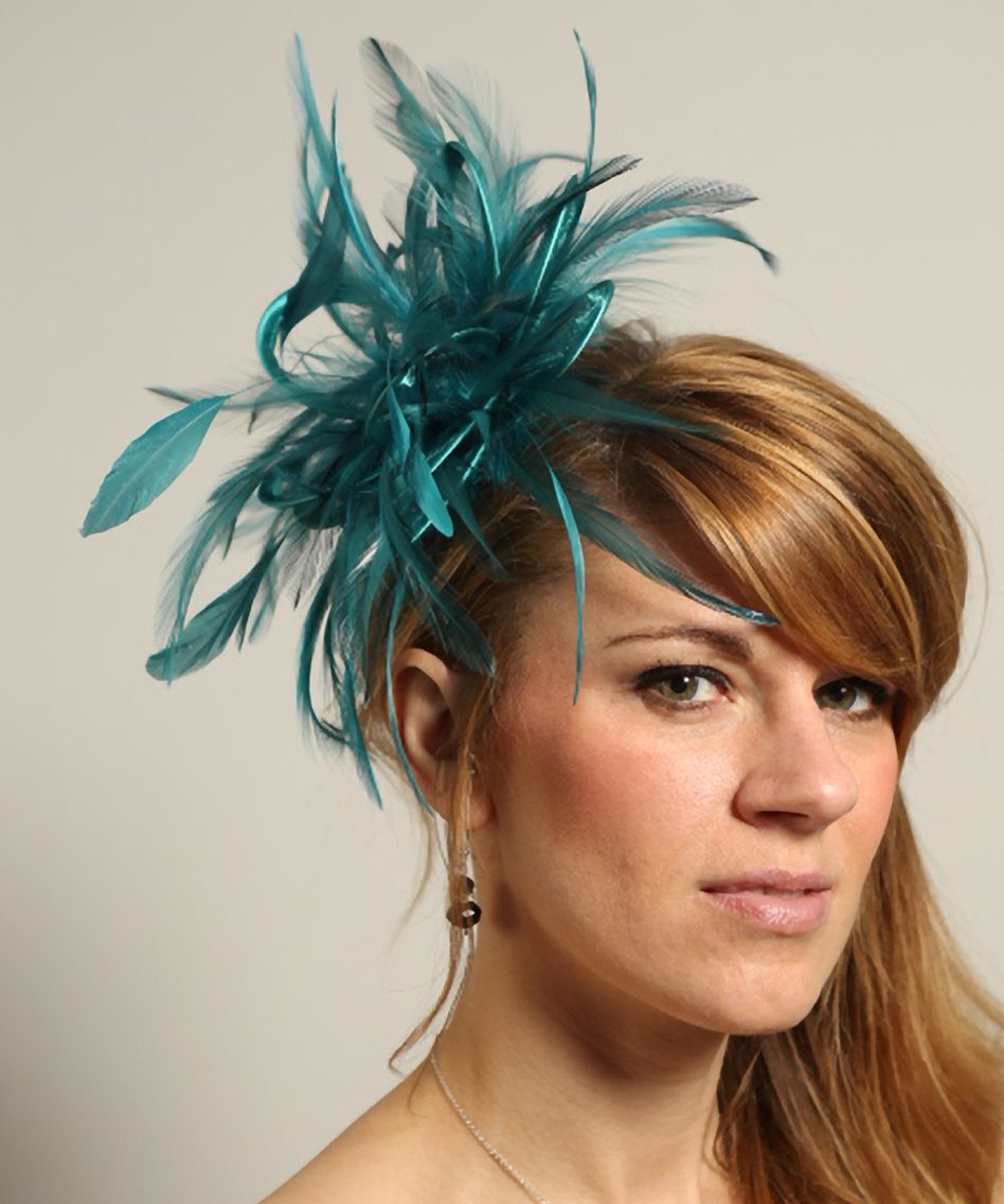 Small Teal fascinator hat made with satin loops and adorned with coque and hackle feathers.
