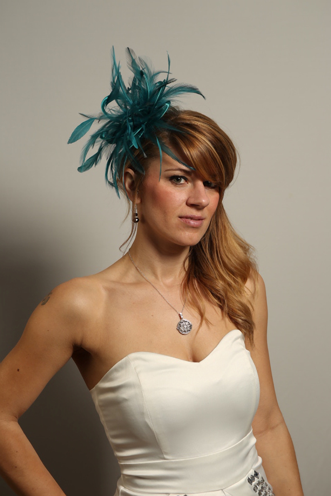 Small Teal fascinator hat made with satin loops and adorned with coque and hackle feathers.
