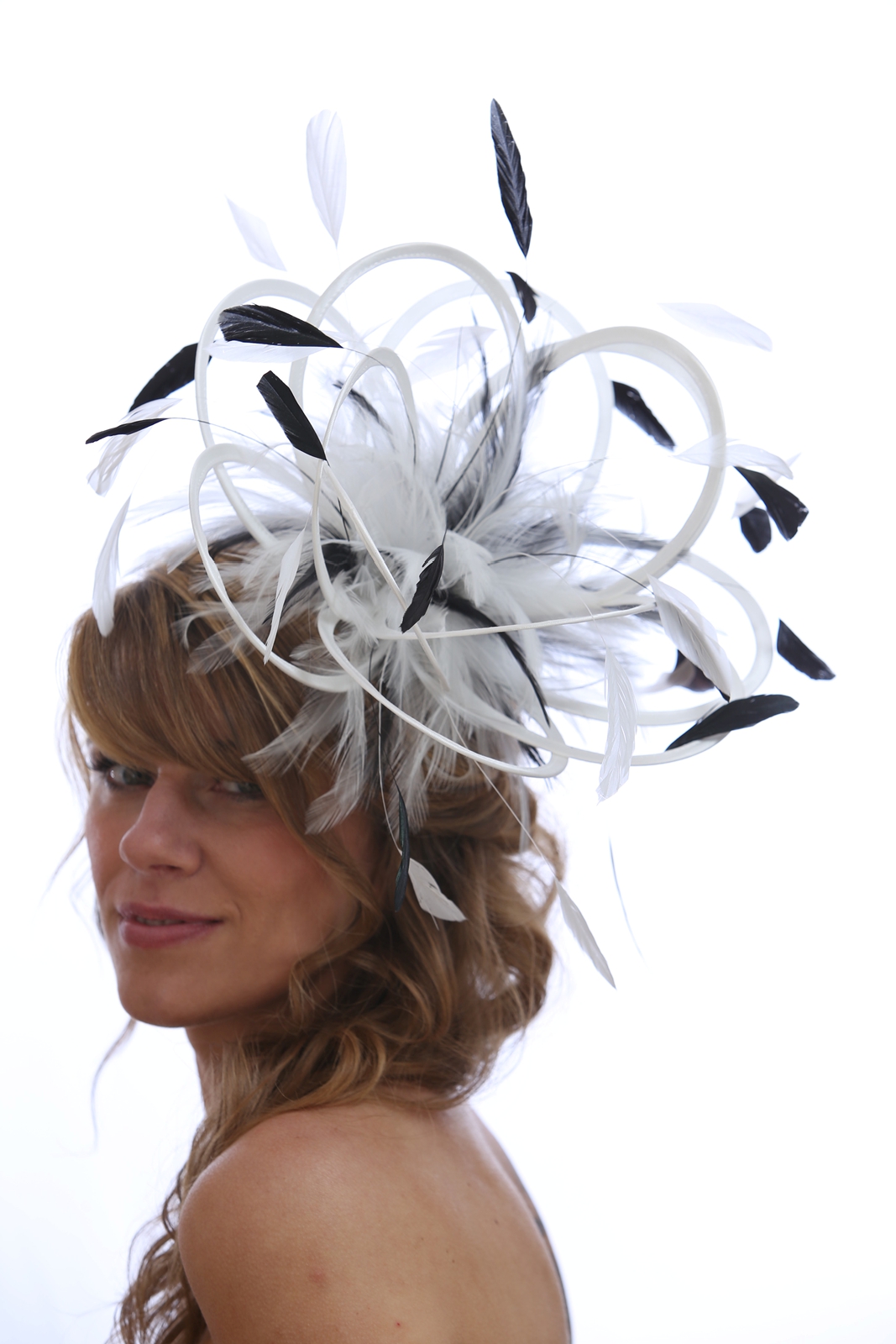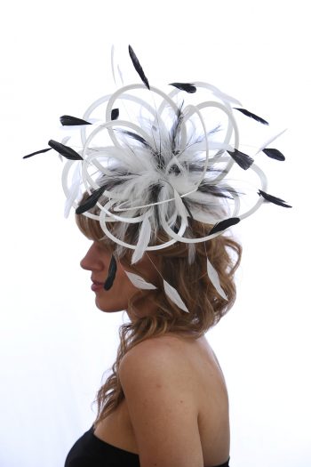 White and Black Satin Feather Medium Fascinator hat – Martha