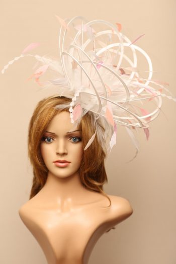 White & Baby Pink Large Satin Feather Fascinator hat with Chevron Cut Coque Tails – Elise